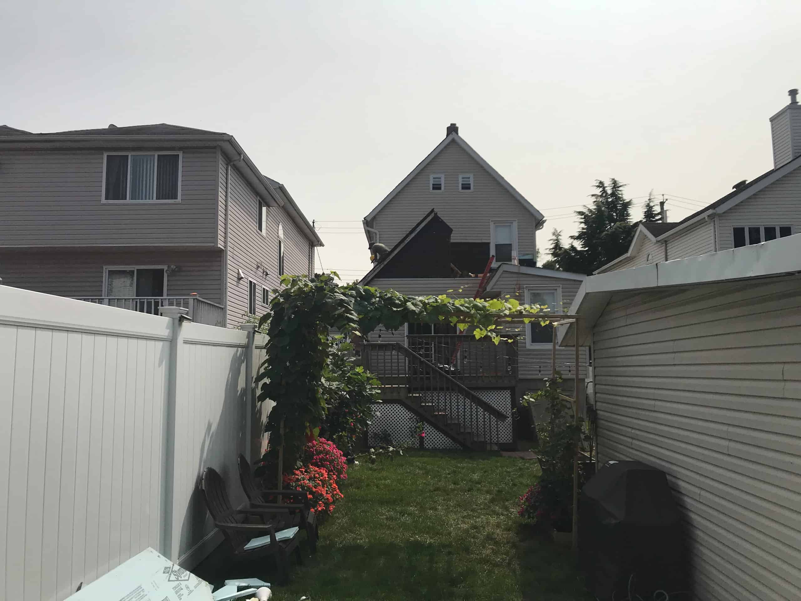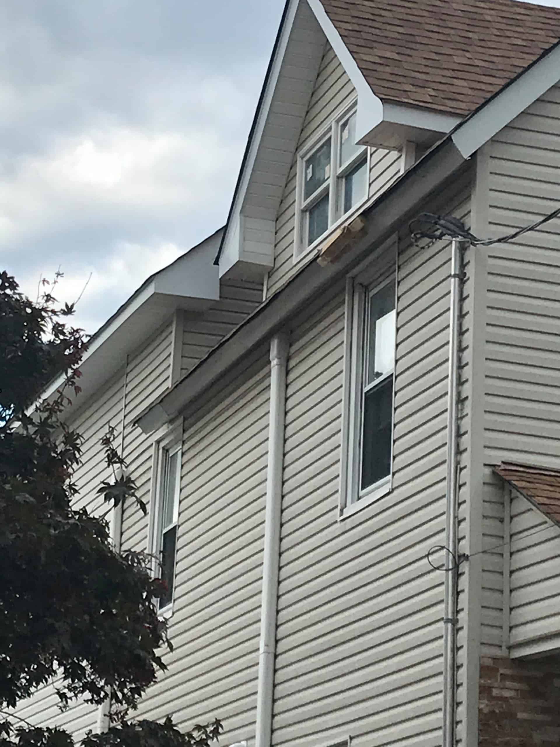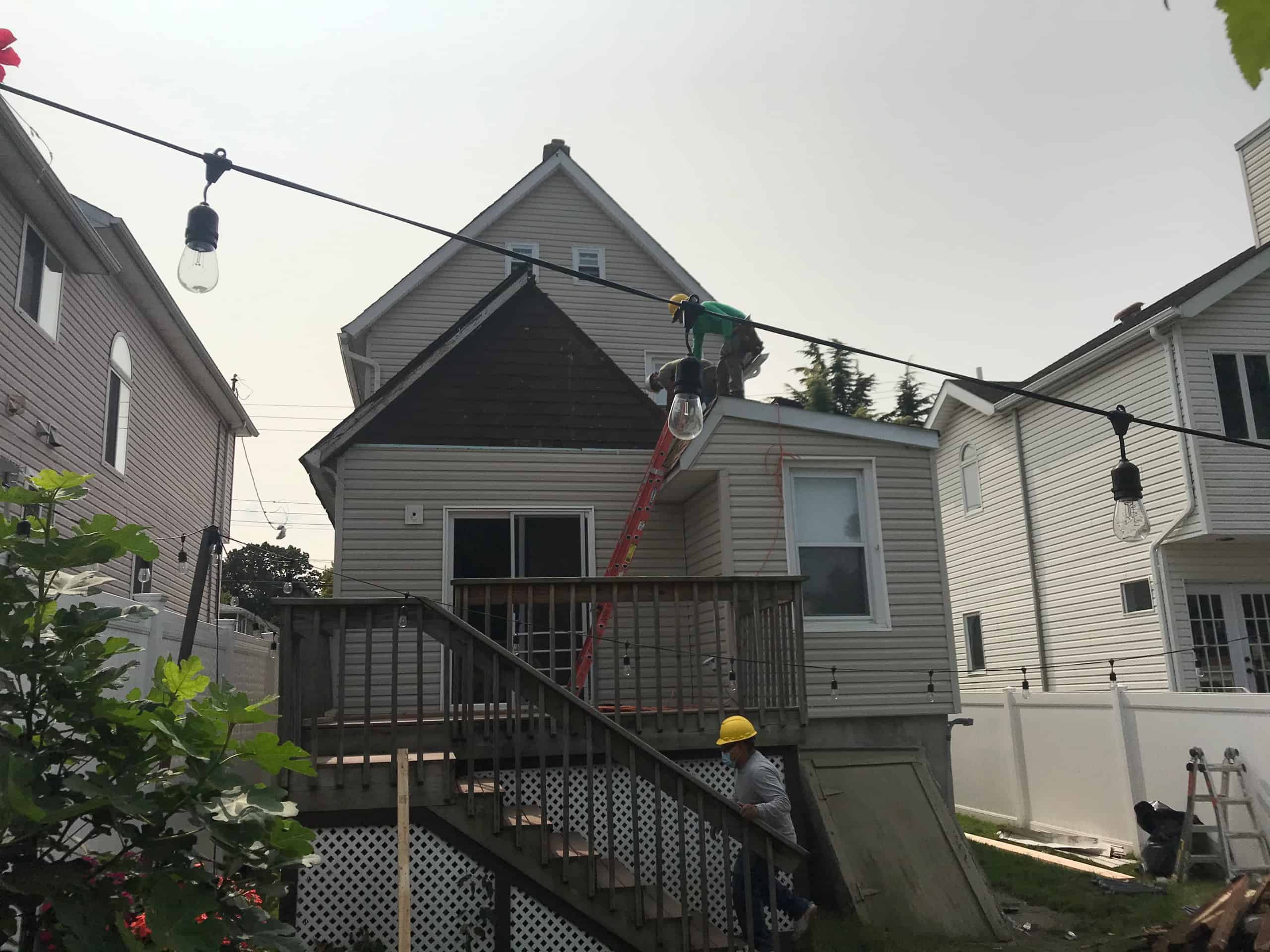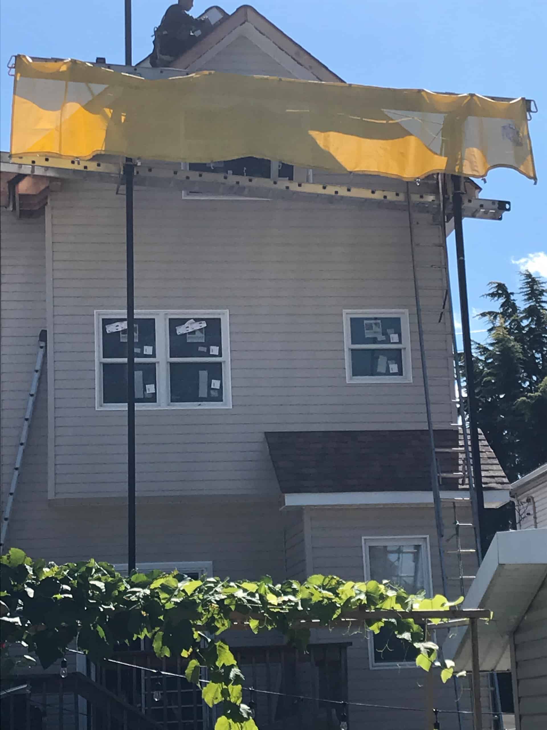 - Removed the existing shingled roof and soffits.
