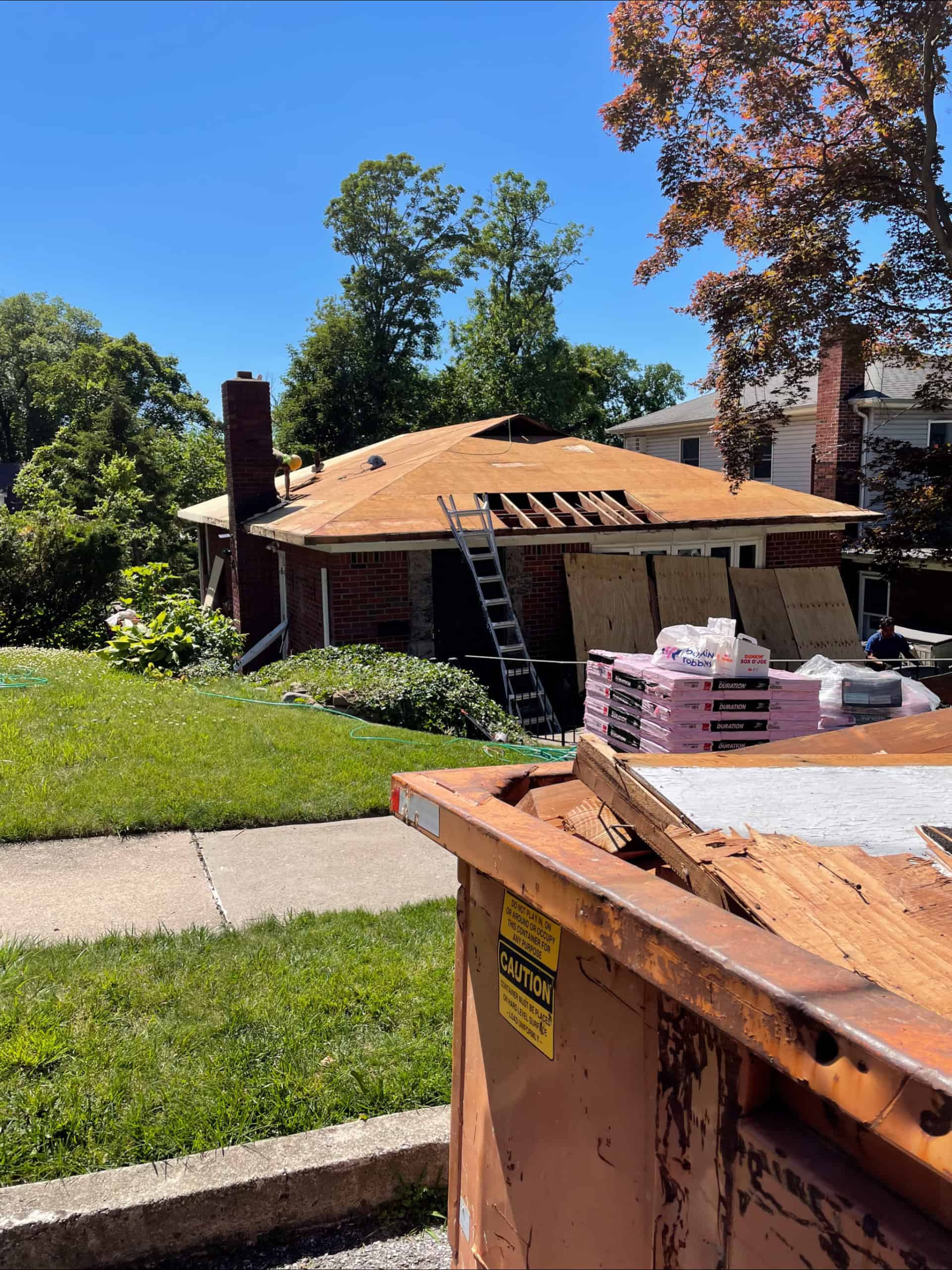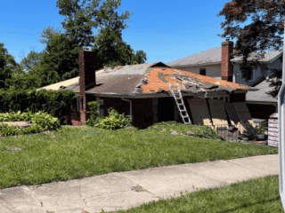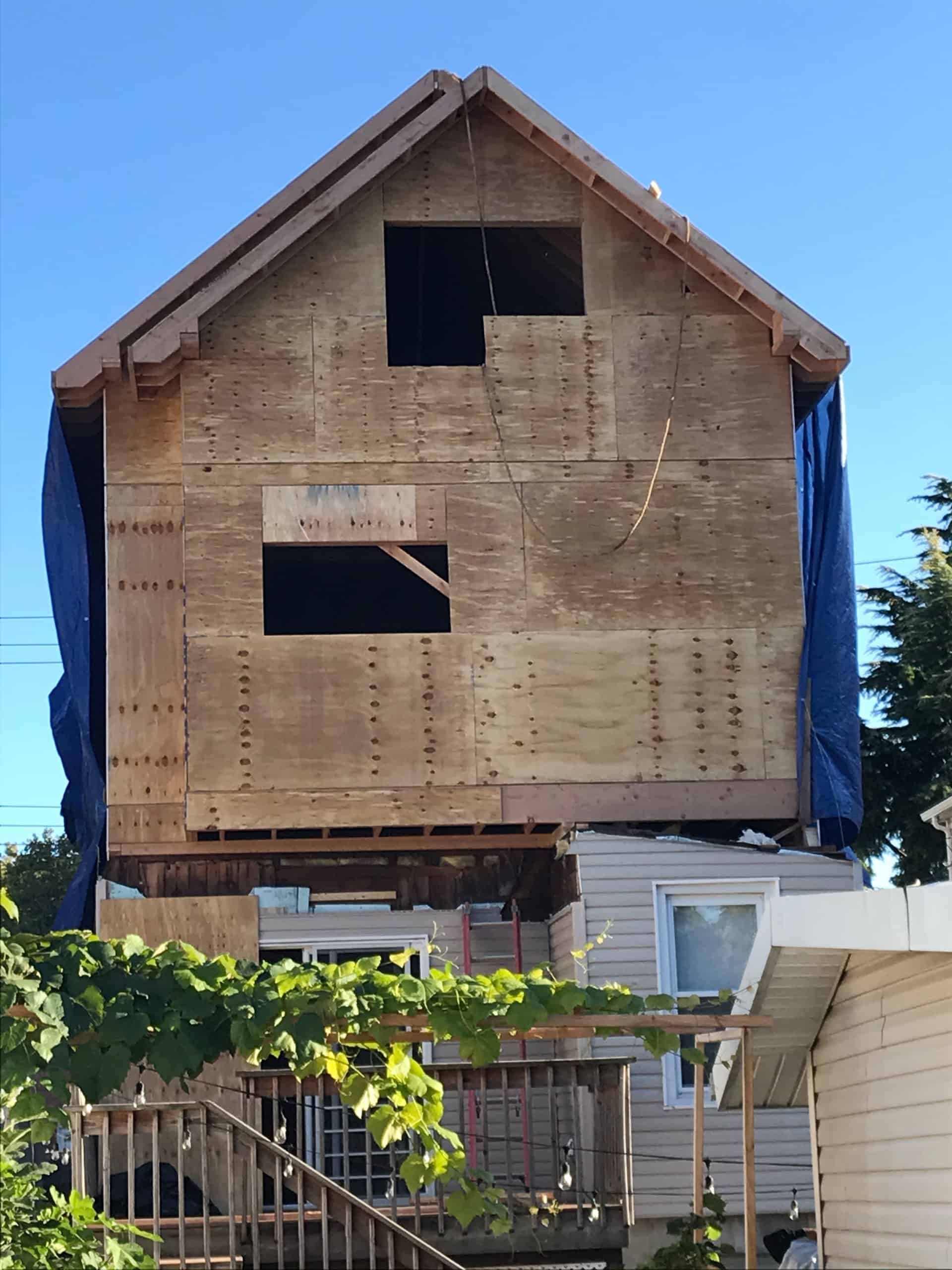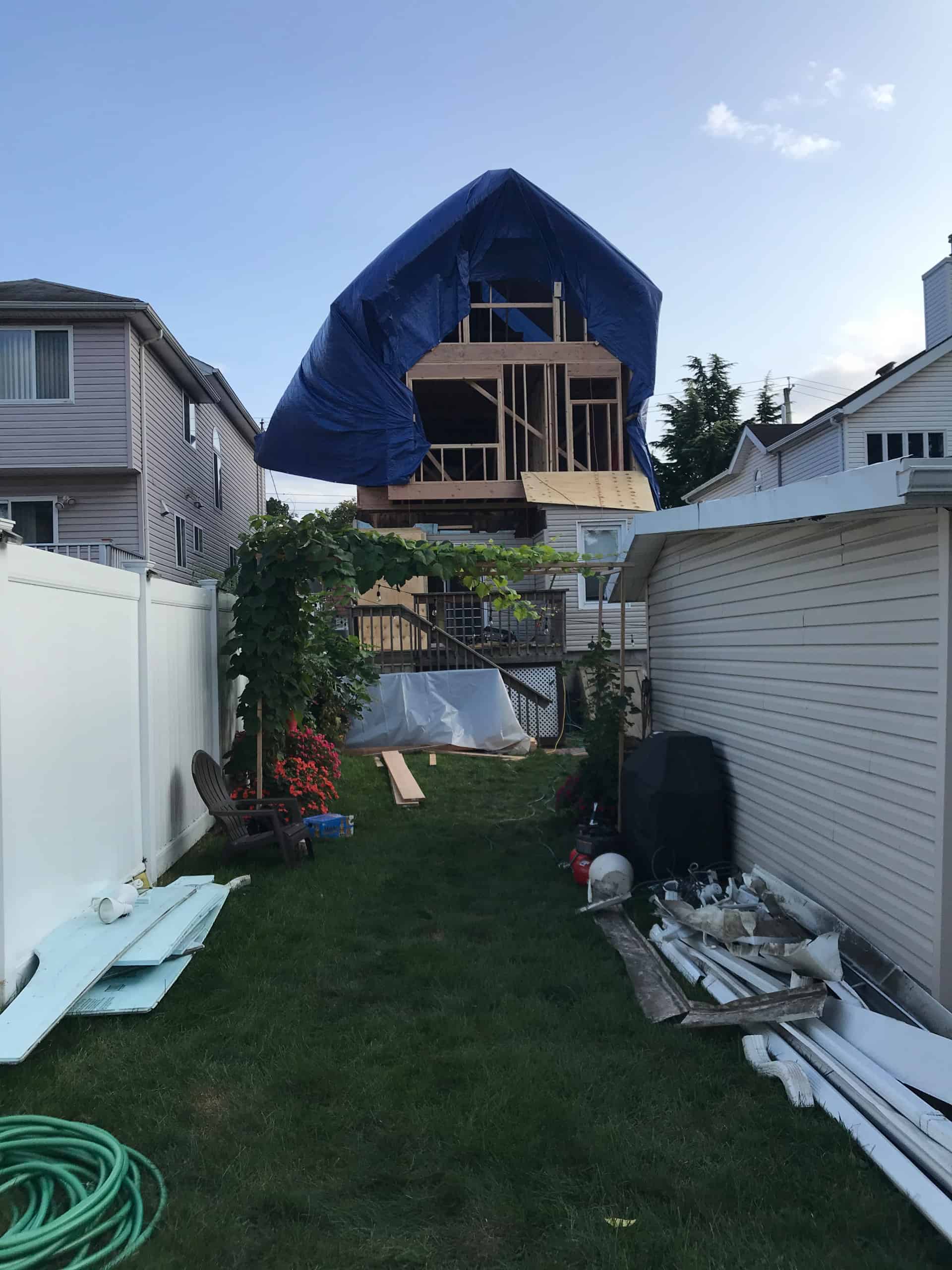 - Removed the existing shingled roof and soffits.